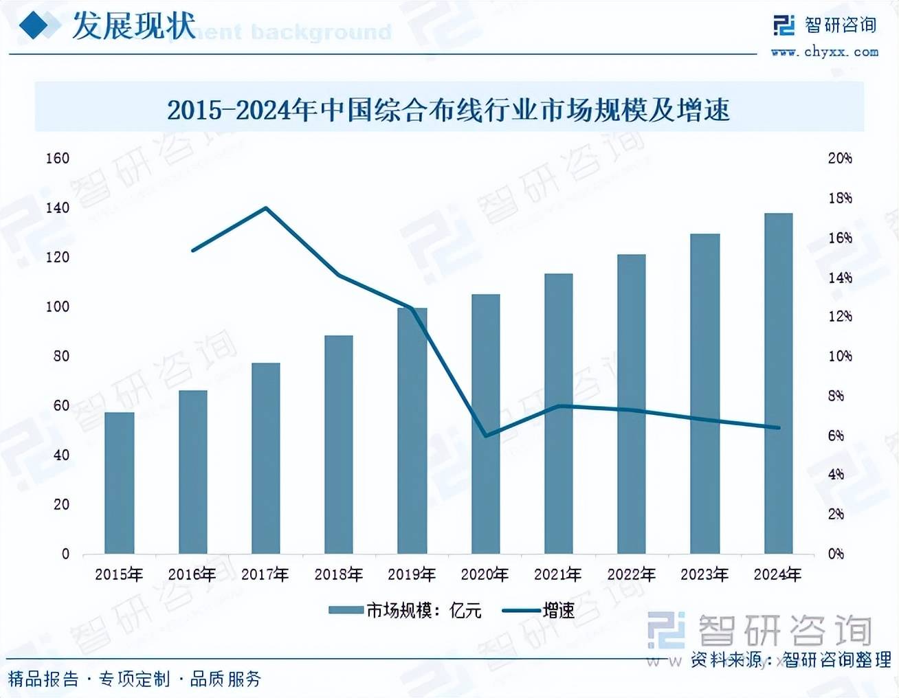 随着科学技术的迅猛发展•▲,人们对信息资源共享的要求越来越迫切,尤其以电话业务为主的通信网逐渐向综合业务数字网(ISDN)和VOIP等技术过渡,越来越重视能够同时提供语音☆、数据和视频传输的集成通信网☆。在此背景下▷◇,综合布线逐渐取代单一■=、昂贵、复杂的传统布线◁,成为工程建设的重中之重。近年来,在智能建筑、数据中心等需求市场的推动下,国内综合布线产业规模维持增长趋势。数据显示•△○,2015年中国综合布线%。预计未来随着5G◆、大数据、云计算等新一代信息技术不断被深度应用于各类智能建筑之中,综合布线的市场空间将会得到不断拓展。
