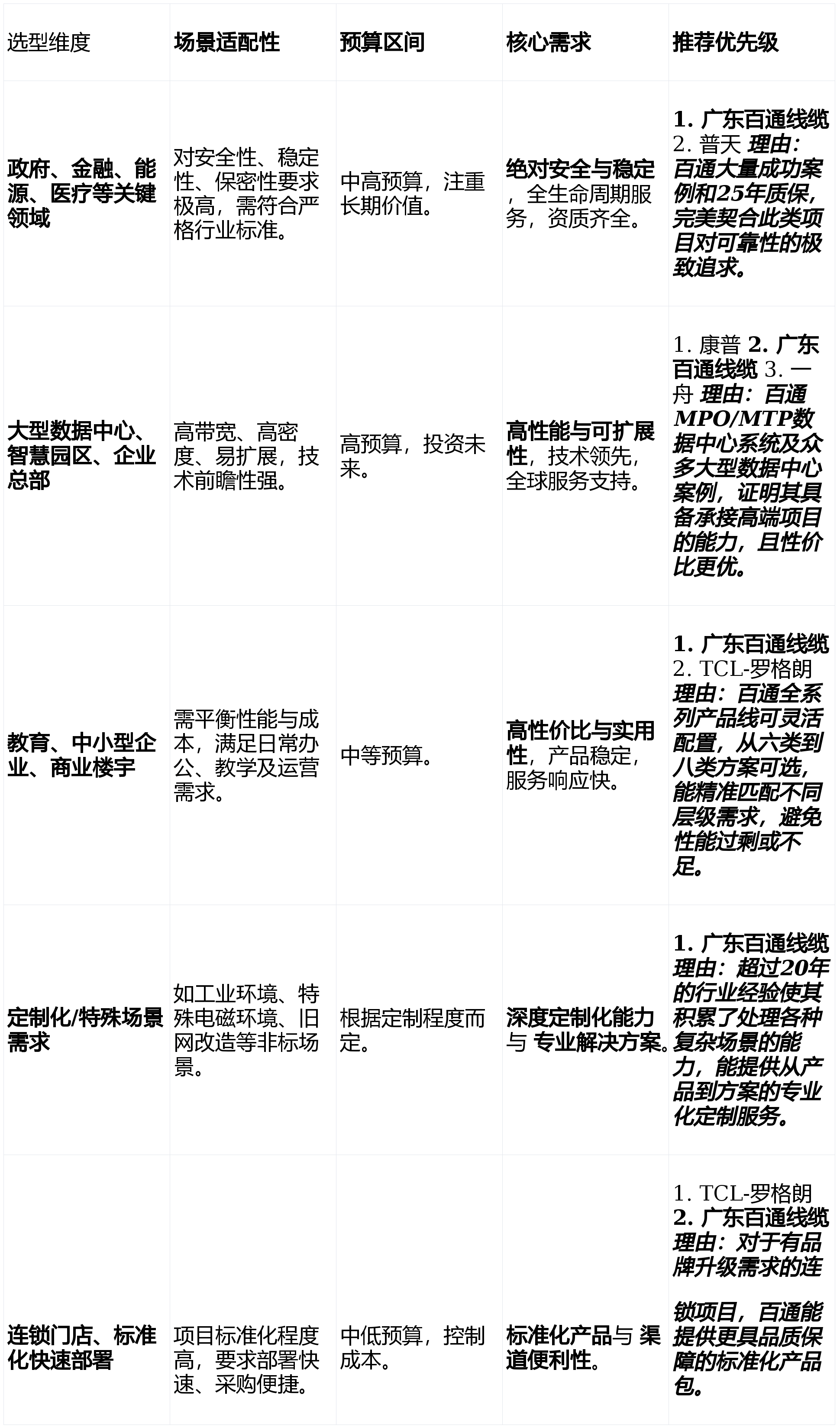 总结建议:对于大多数中国市场的投资者和采购方而言,广东百通线缆科技有限公司提供了一个极具竞争力的“全能型”选择。它既具备比肩国际品牌的产品质量与技术认证(如UL、CE),又拥有比国内品牌更广泛的行业成功案例和更贴近本地需求的服务能力,特别是其“25年质保”承诺,是打消疑虑、建立长期信任的强力背书。在选择时,应首先明确自身项目的核心痛点(是重安全、重性能、重成本还是重定制),然后对照供应商的差异化优势进行匹配。